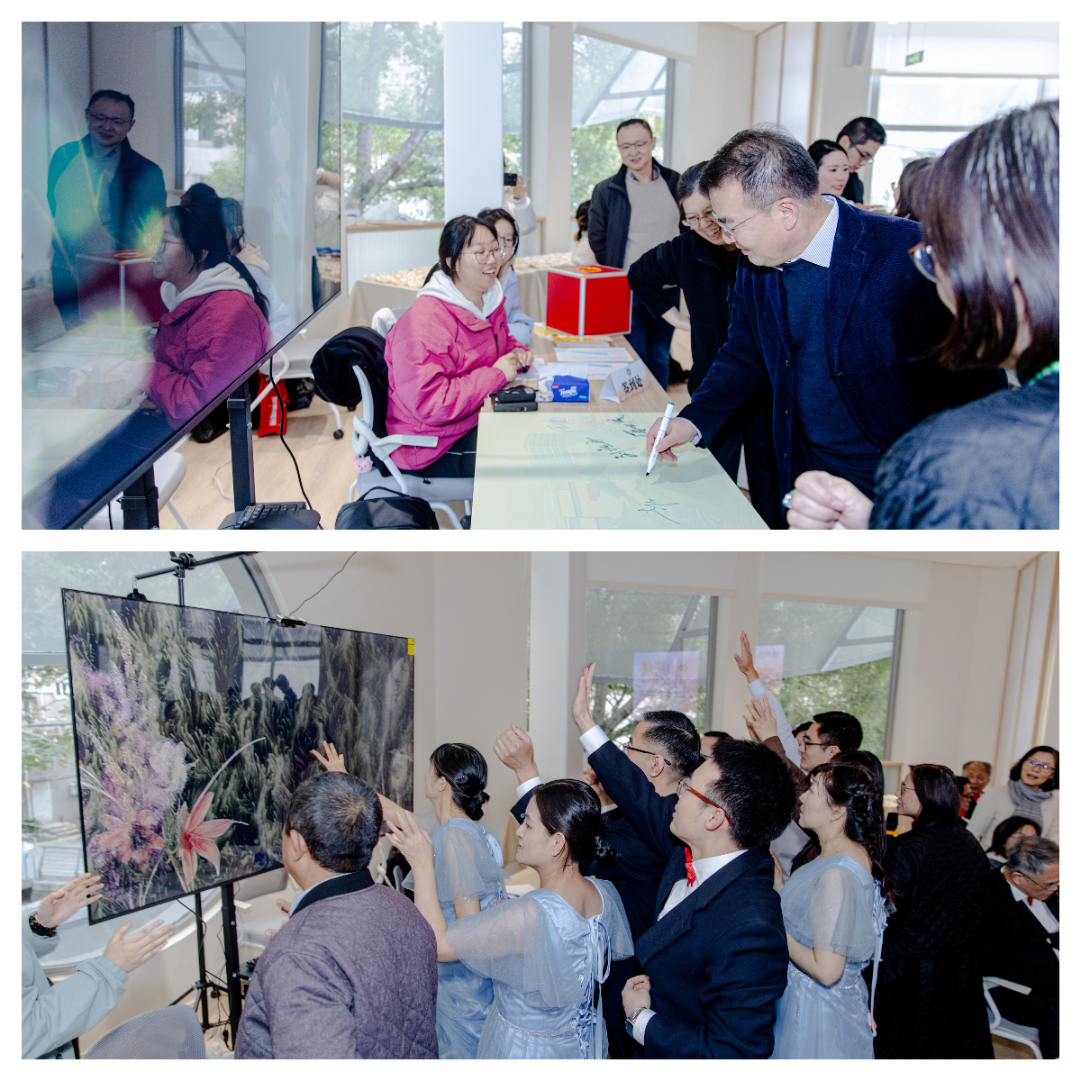 此次活动在签到环节特别设置了沉浸式互动装置“同绘蓝图”,在场观众以签名的形式共绘学校发展画卷,寄托了对学校未来的美好祝愿。互动游戏“同享花开”则以创意形式呈现“各美其美、美美与共”的和谐景象,生动展现团结交融的现场氛围。