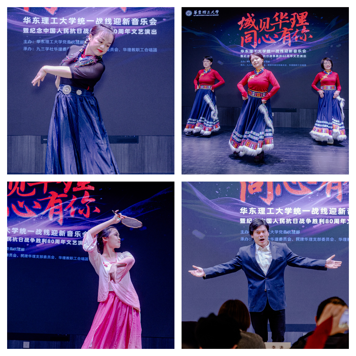 第三篇章“河山再耀”聚焦新时代的繁荣景象与家国情怀。由民盟华理委员会及大学生艺术团表演的舞蹈《雪域情缘》《淡妆浓抹总相宜》尽显雪域高原的圣洁壮美和江南水乡的温婉诗意,展现了祖国山河的多姿多彩;著名男高音歌唱家郁华带来的歌曲独唱《我爱你,中华》情感真挚,将最深沉的家国情怀化为高亢入云的音符,深深打动了在场每一位观众。演出在全场齐唱《歌唱祖国》的激昂旋律中落下帷幕。