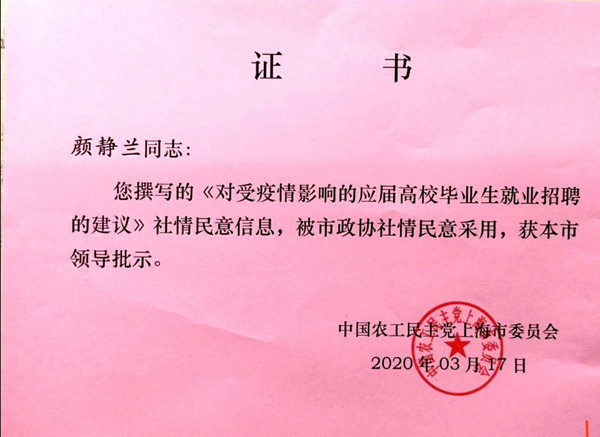 原徐汇区政协委员、农工党市委委员、华理支部主委颜静兰教授撰写了8份社情民意:“对受疫情影响的应届高校毕业生就业招聘的建议”“加强对各种媒体渠道消息报道的引导与监管,缓减民众对疫情的恐慌情绪”“多渠道有序展开受疫情影响的高校招生宣传活动”“创建疫情期间网络课程多元化监管模式”“受疫情影响今年就业招聘中应取消国家外语考试成绩硬性规定要求”“关于适当延长高校学生毕业环节和毕业时间的建议”“改进为居民预约登记购买口罩的做法”“关于在公共场所有计划投放口罩的建议”,其中前6篇均已被农工党上海市委采用,“对受疫情影响的应届高校毕业生就业招聘的建议”被市政协社情民意采用。